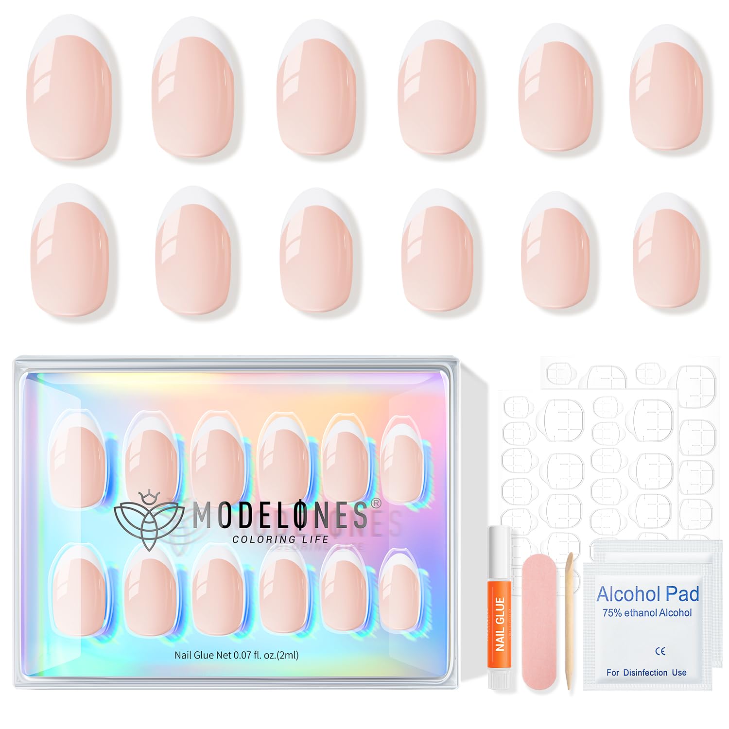 modelones French Tip Press On Nails, Short Oval Fake Nails Press Ons with Nail Glue, Adhesive Tabs, Nail File, Prep Pad, Manicure Stick, 32Pcs 16 Sizes, Nude, Fall Halloween