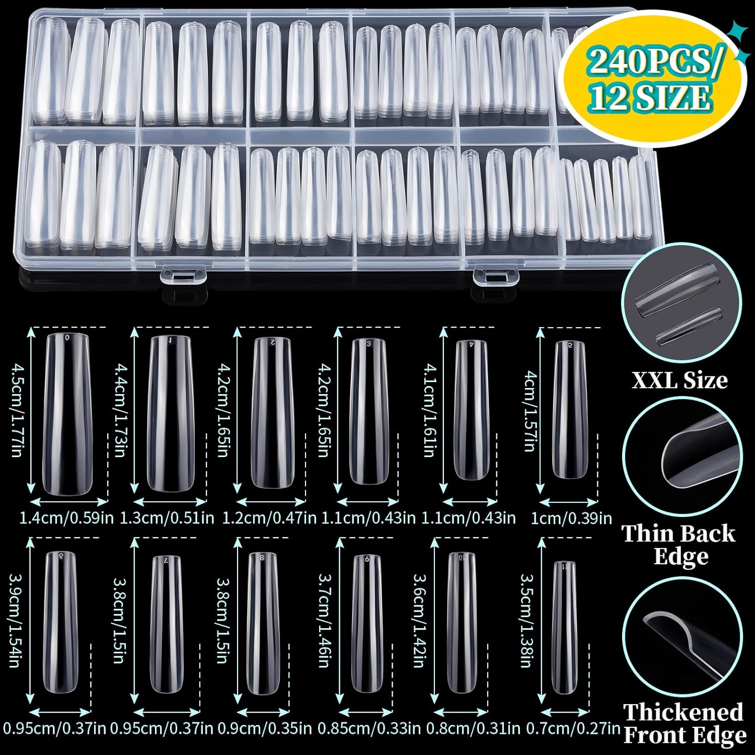 240pcs 12 Sizes of Acrylic Nail Tips: Made of high quality soft gel material, thin back edge make it easier full cover your natural nails and thickened front edge without cracking easily, XXL size is long enough to meet your all kinds of nail design; 12 size can choose, you also can cut it to proper length to start your nail art design, suitable for nail extensions and can be used with nail polish, chrome nail powder, dip powder and so on