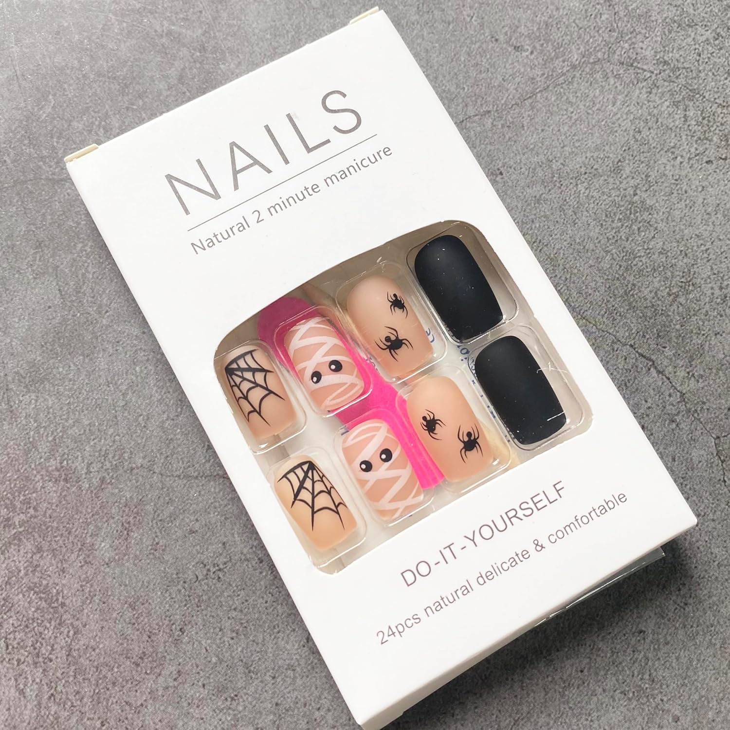 Easy to Use➤ Square press on nails with spider designs just choose the nail piece that suits you, polish the nail bed, stick the jelly glue we give away on your nails, then press the fashion fake nails on the nails for 30 seconds to get the natural manicure that girls love.