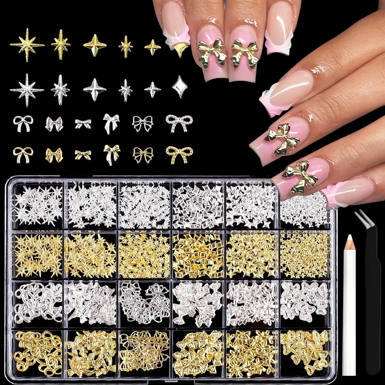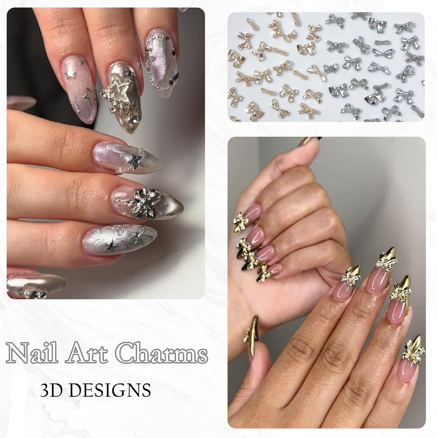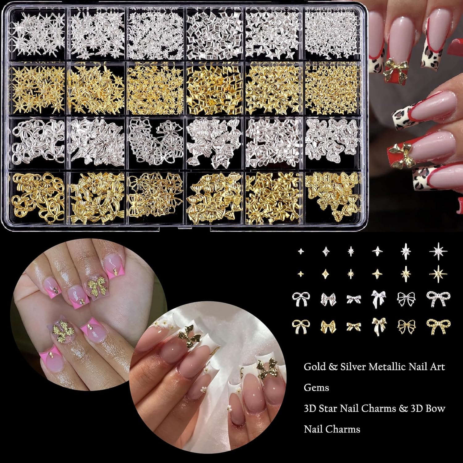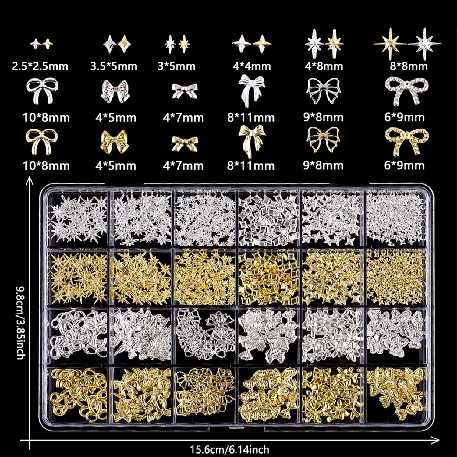 12 Elegant Nail Charms: Includes 6 gold and silver star-shaped metal charms and 6 gold and silver bow-knot nail charms, perfect for creating cute, elegant, or glamorous nail art looks