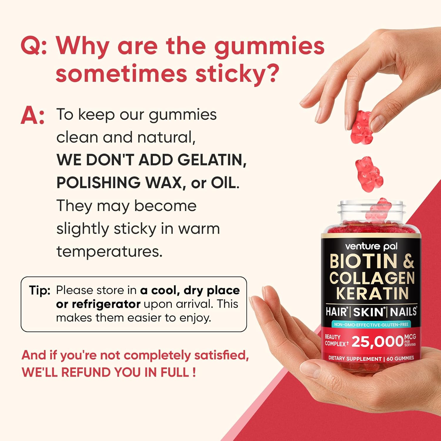 Trusted Quality: Venture Pal Biotin Gummies are third-party tested for potency and purity. They’re proudly non-GMO, gluten-free, and backed by a 100% satisfaction guarantee—try them risk-free and feel the difference premium hair growth vitamins can make