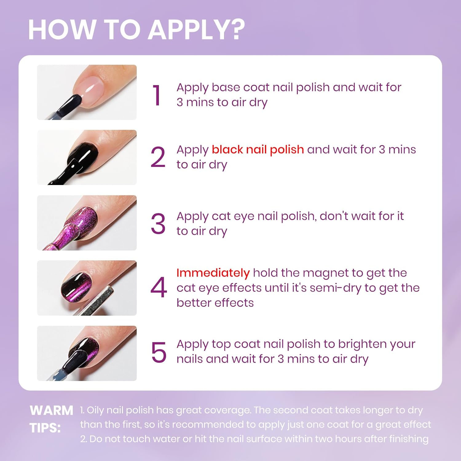 Important Tips: 1. Apply black nail polish as a base coat, then apply cat eye nail polish 2. When the nail polish is not dry yet, it will be fluid. Use magnets to hold it in place until it’s semi-dry, then take them off for a sharp cat-eye look 3. Do not touch water or hit the nail surface within two hours after finishing to avoid peeling; 4. Base and top coat nail polish art necessary