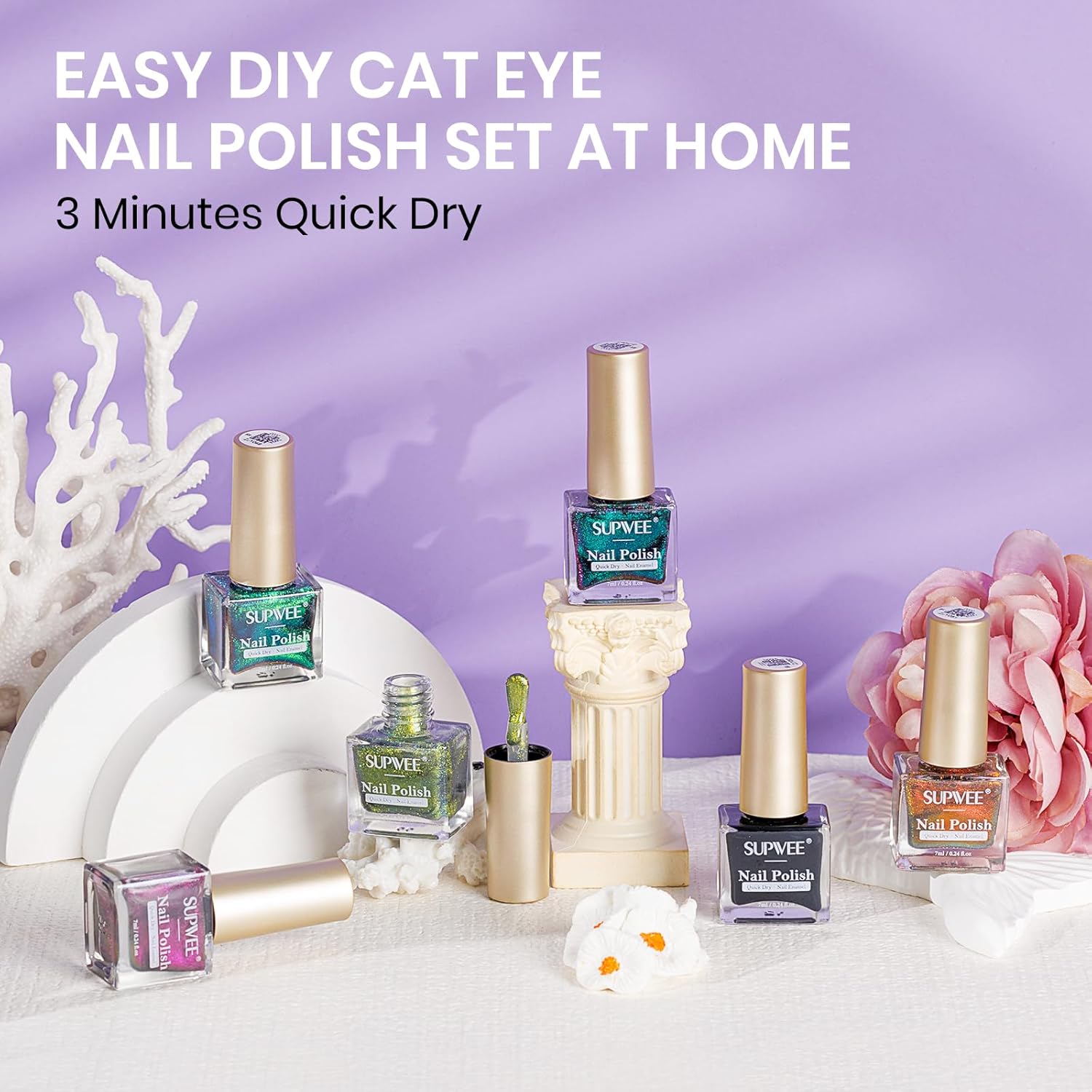 Quick Dry 9D Cat Eye Nail Polish Set: This magnetic nail polish set includes 1 bottle of black nail polish and 5 bottles of cat eye polish. Apply the black base coat first, then layer on the dazzling cat eye polish to achieve a versatile, mesmerizing multi-color cat eye effect, adding a stunning highlight to your nail art.