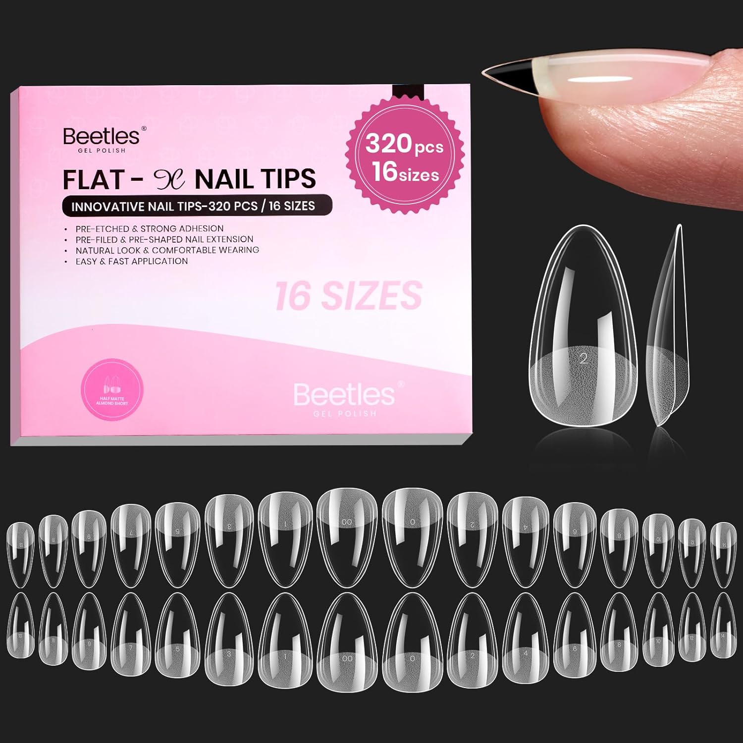 Beetles Flat-X Almond Nail Tips: Tired of nail tips that lift and don’t fit properly? Beetles flat-X nail tips almond shape feature a gentle arc that lays flush with your natural nail. This design ensures even pressure distribution for a secure fit with no lifting, just comfort. Perfect for flat and natural nail beds