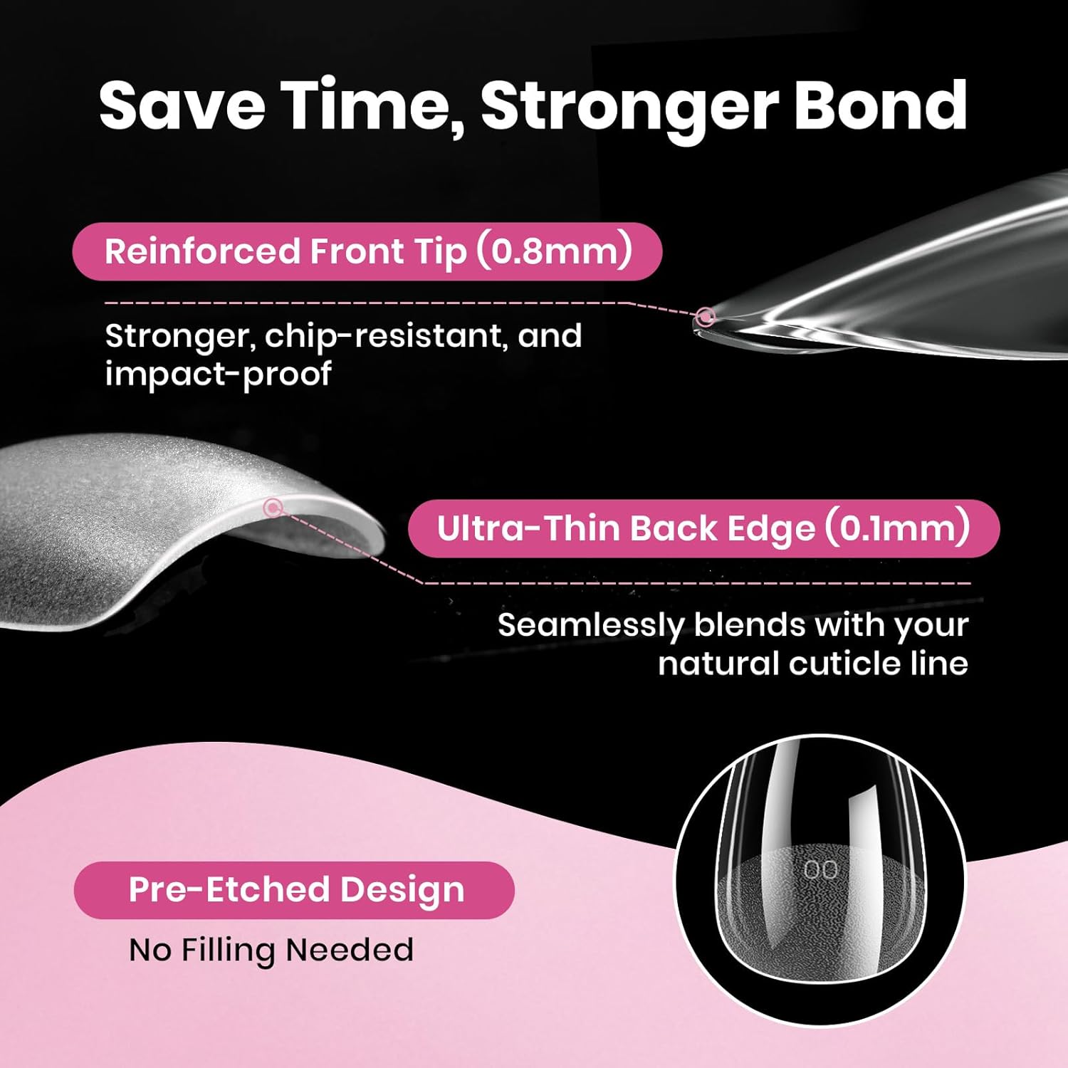 Long Lasting 28 days+: Upgraded pre-etched fake nail tips eliminate the need for shaping and filing, reducing polishing time and increasing the contact area between glue and tips for improved adhesion. The thin back edge seamlessly adheres to your natural nail, extending your nails in just 3 minutes and showing them off for over 4 weeks