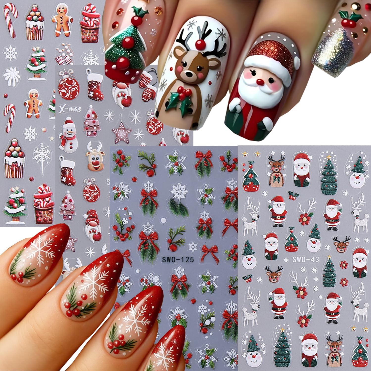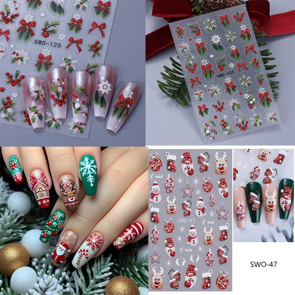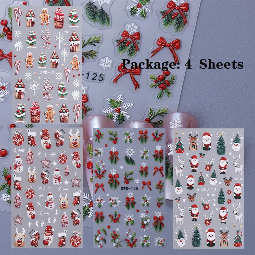 Christmas Nail Stickers➤4 sheets embossed christmas delicated nail stickers give people an intuitive and bumper newyear feeling, and satisfy your rich imagination of nail DIY.