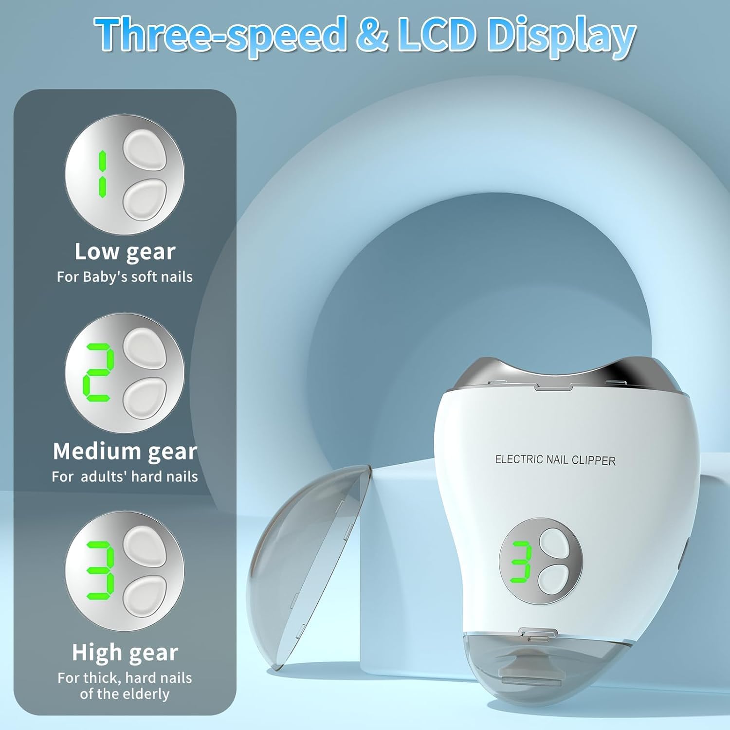 【3 Speed Gears for Anyone】The electric nail clippers for seniors are not just for little babies, they have three speed gears for different group people. Gear 1 is suitable for small children with soft nails, gear 2 & 3 is suitable for adults with hard nails. From children to adults, anyone can easily use it to keep nails tidy. Note: This product is not suitable for trimming toenails