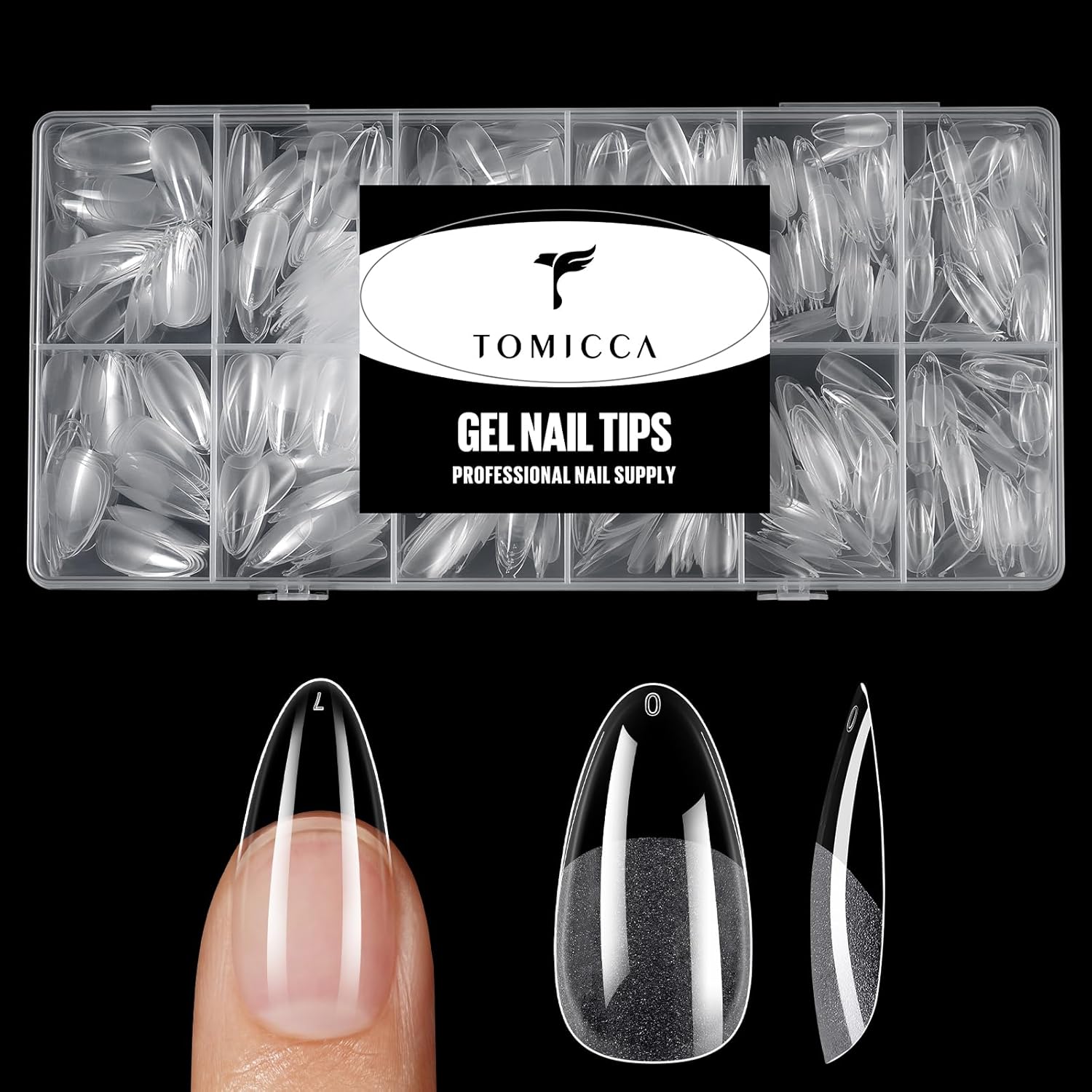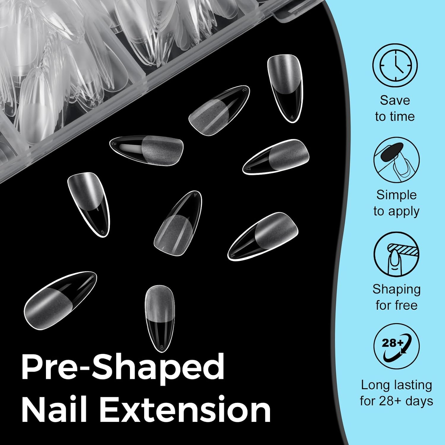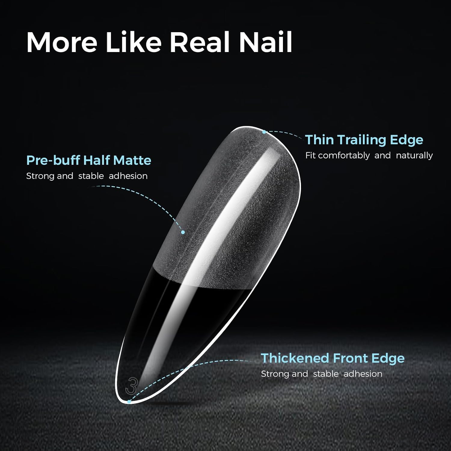 【HALF MATTE / PRE SHAPED / NO FILING】These half matte medium almond nail tips are pre shaped clear nail tips and no filing gel nail tips, bonding fast with gel nail glue to save prep time while protecting natural nails.
