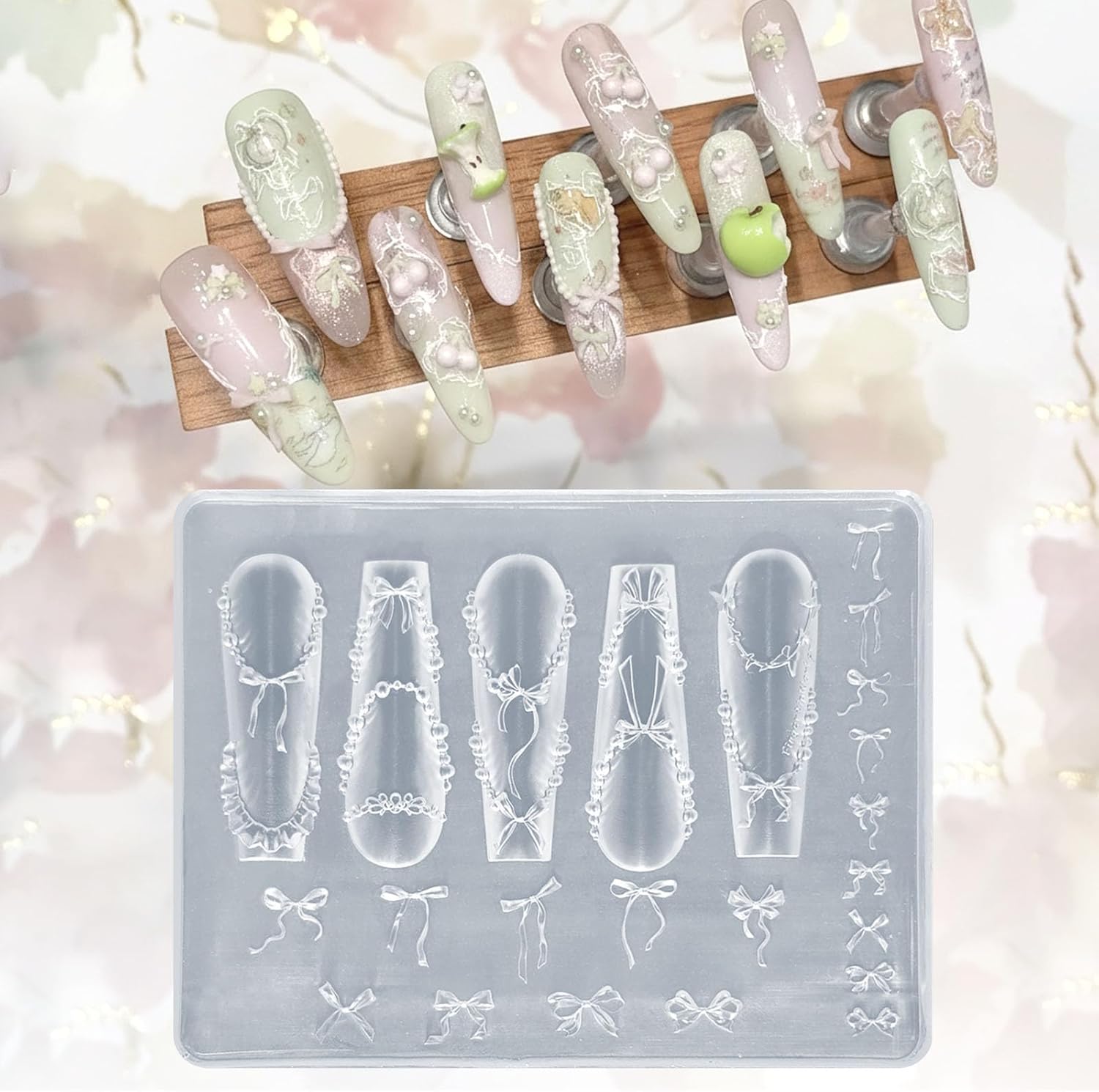 Unique Pearl Necklace Bow Silicone Nail Mold: This princess necklace nail art mold features clearly visible surface textures. Inspired by a unique pearl necklace bow design, this 3D nail molds features multiple bow shapes and delicate pearl necklace and lace hem patterns, making it perfect for creating elegant, high-quality nail accessories, ideal for a princess style.