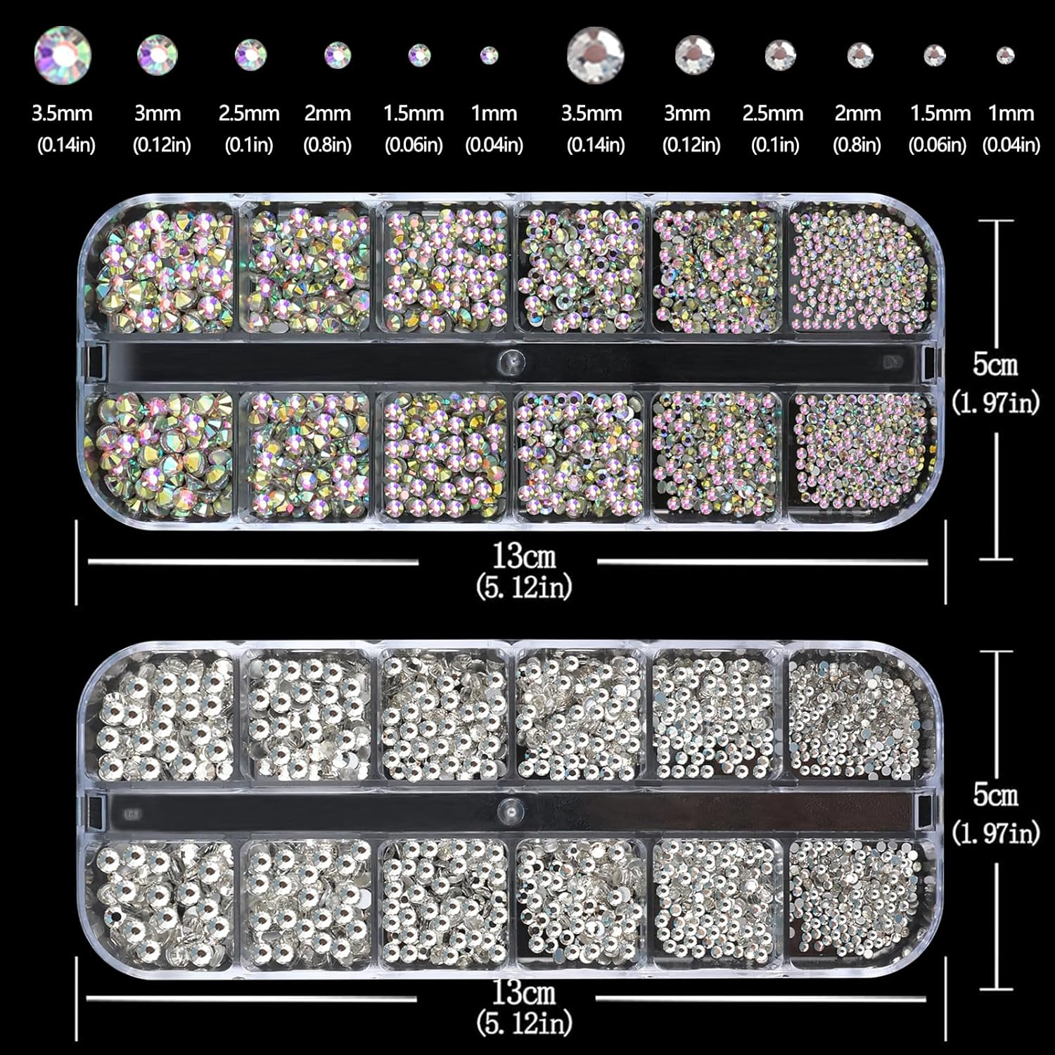 I got the "12-Colorful" version and I like the mix of sizes, as well as the silver, copper, gold colorings of the metal balls. Even the largest pieces fit reasonably on a nail. The pearl-like pieces are flat-backed which makes them much easier to attach. The pickup pen picks up and lets go of the pieces when I want it to, and the tines on the tweezers meet straight on. Some of the pearl-y pieces are attached together on their sides which seems like manufacturing just didn't finish separating them all. But: they're easy to separate and there is no visual defect left on the ones that I've had to pull apart.