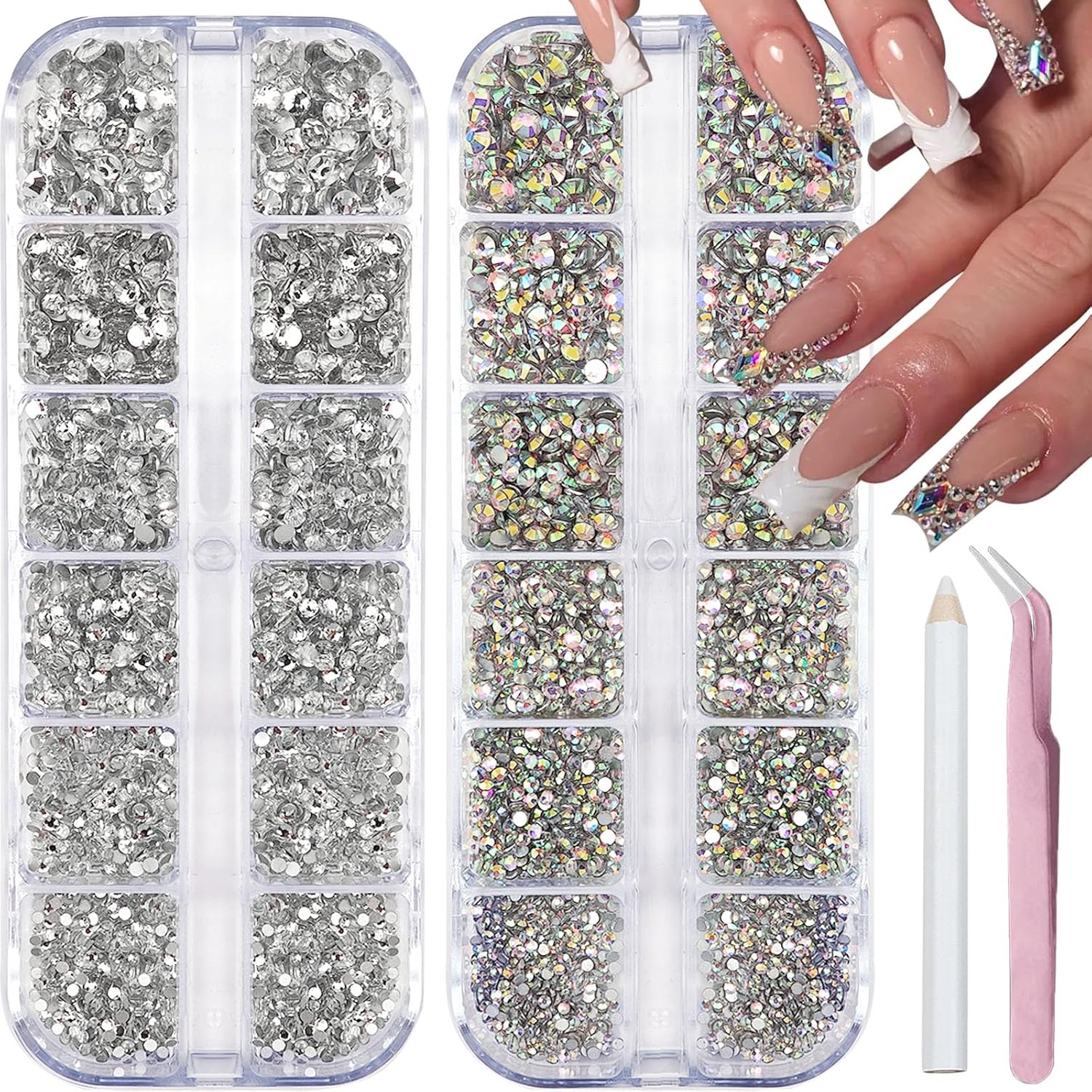 I got the "12-Colorful" version and I like the mix of sizes, as well as the silver, copper, gold colorings of the metal balls. Even the largest pieces fit reasonably on a nail. The pearl-like pieces are flat-backed which makes them much easier to attach. The pickup pen picks up and lets go of the pieces when I want it to, and the tines on the tweezers meet straight on. Some of the pearl-y pieces are attached together on their sides which seems like manufacturing just didn't finish separating them all. But: they're easy to separate and there is no visual defect left on the ones that I've had to pull apart.