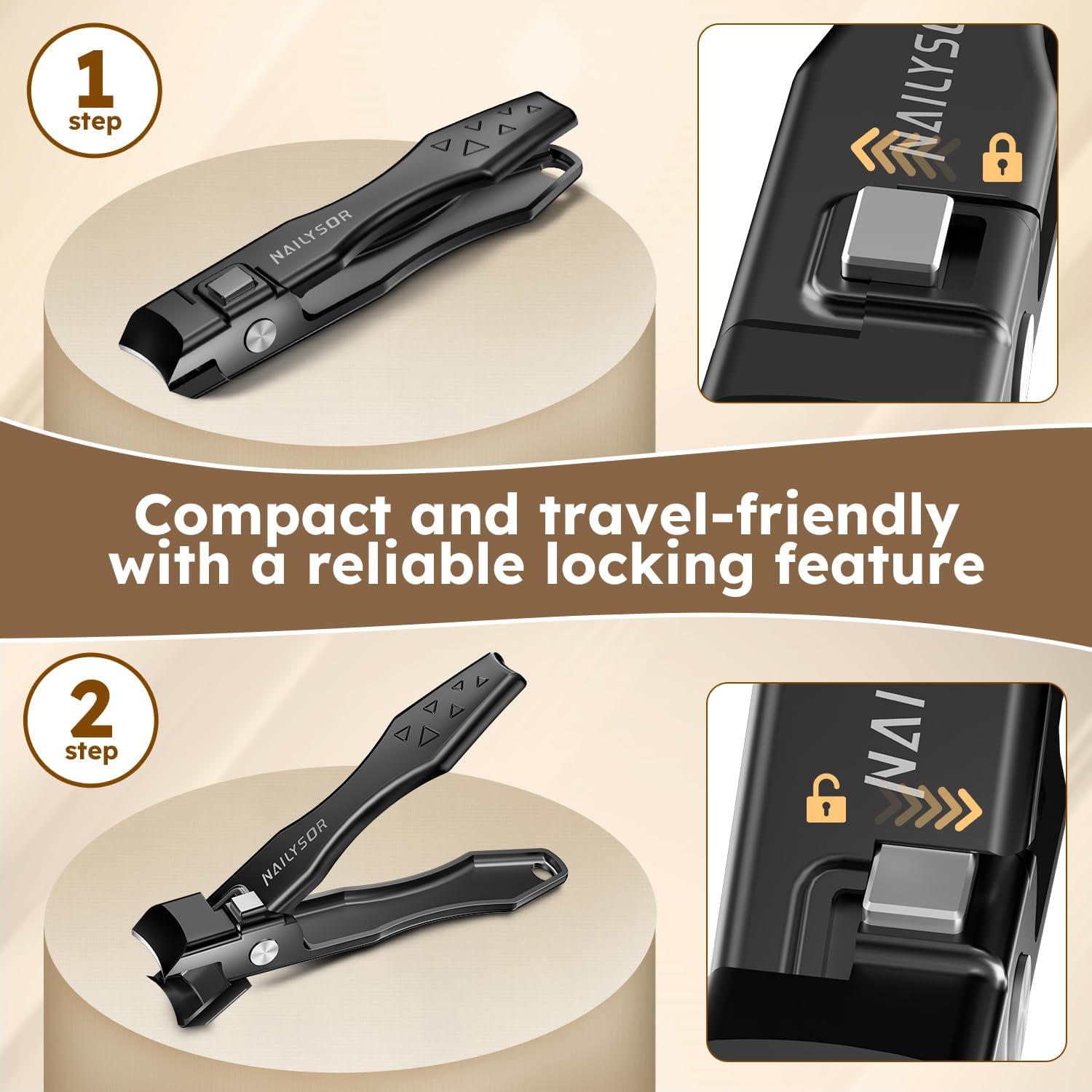 Anti-Splash Toenail Clippers with Safety Lock – These nail clippers for men feature a built-in catcher to prevent nail splashes and keep your space clean. Designed with a wide jaw and sharp blades for thick nails, they also include a safety lock—just slide to lock when not in use for secure storage.