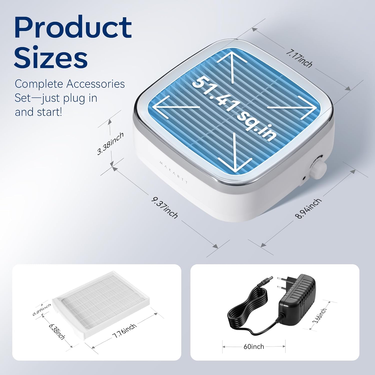 Plug-in Dust Collector Nail Tech: It includes 1x nail vacuum dust collector, 1x reusable filter (pre-installed), and 1x power adapter. Makartt dust fan for nail tech is certified by CE, FCC and UL for safe and reliable use